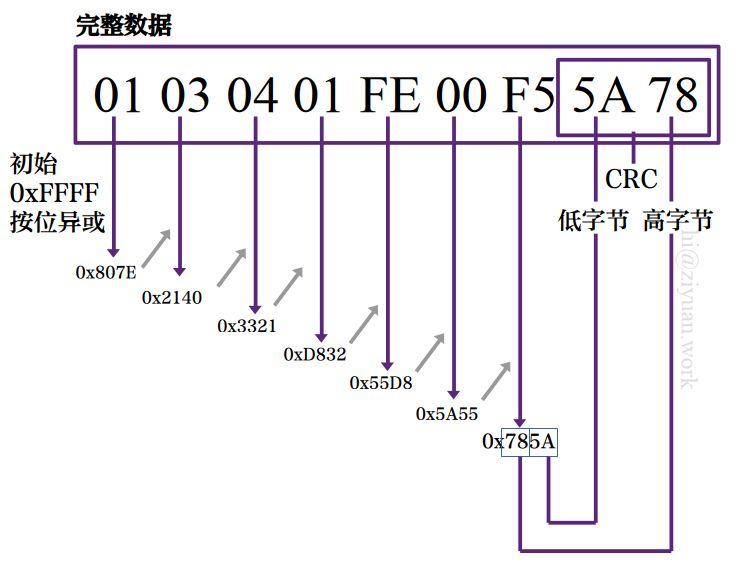初始化一个寄存器为0xFFFF,逐步与每个数据帧进行异或操作。